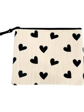 Het hart van dit pakket is een compact opbergtasje van ribstof met een speelse hartjesprint. Handig voor make-up, pennen of andere kleine essentials – en bovendien een vrolijke toevoeging aan iemands tas of bureau.