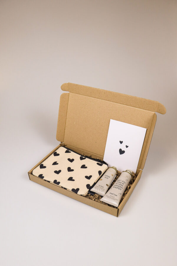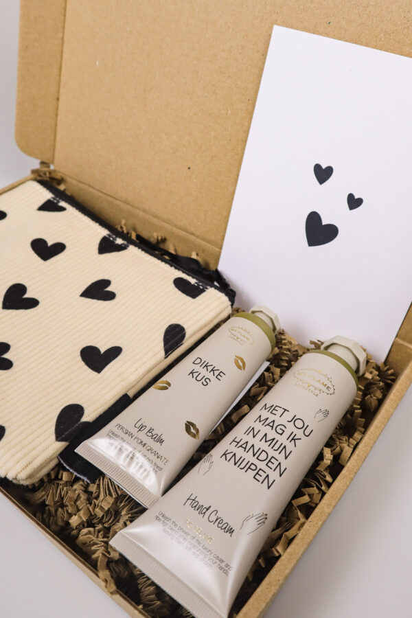 Verzorgend brievenbuscadeau met hartjes: ribstof opbergtasje, lippenbalsem, handcrème en kaart. Perfect om liefdevol iemand te verrassen.