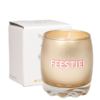 Een biologische sojakaars met de feestelijke geur van Silky Tonka. Lichtroze wax en ‘Feestje!’-tekst. Brandtijd ca. 20 uur. Perfect voor elk feestje!