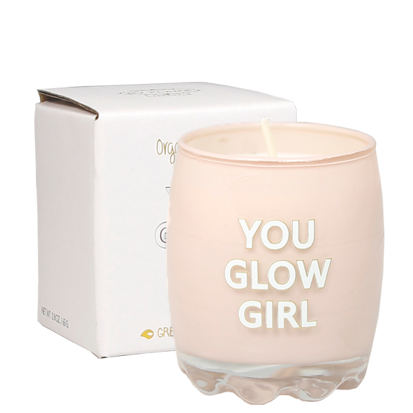 Een biologische sojakaars met de frisse geur van Green Tea Time. Lichtgroene wax en inspirerende ‘You Glow Girl’-tekst. Brandtijd ca. 20 uur.