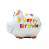 Feestelijke witte spaarpot in de vorm van een varkentje met kleurrijke ballonnen en de tekst “Happy Birthday”. Een vrolijke manier om te sparen voor verjaardagen en een geweldig cadeau voor elke gelegenheid!